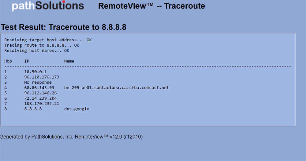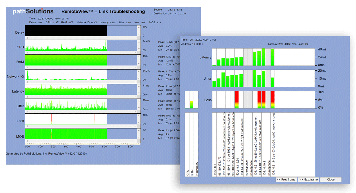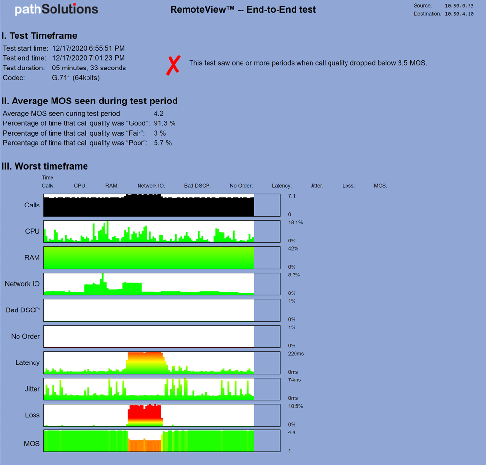 The end-to-end test will evaluate packet stability for VoIP/UC to a specified endpoint. You can see latency, jitter, loss, out-of-order, and MOS. Additionally, you can track CPU utilization, free RAM, and network IO to help spot problems.