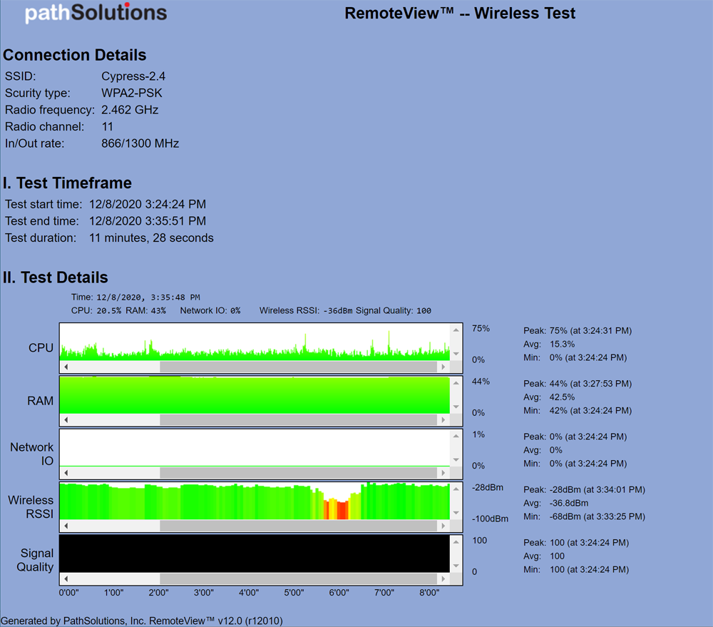 The wireless signal strength test shows the user’s connected SSID name, radio type, frequency, channel usage, as well as input/output rate. RSSI dBm is shown over time so the user can walk around and do a signal strength mapping of their house to determine where their signal strength is strongest vs weakest.