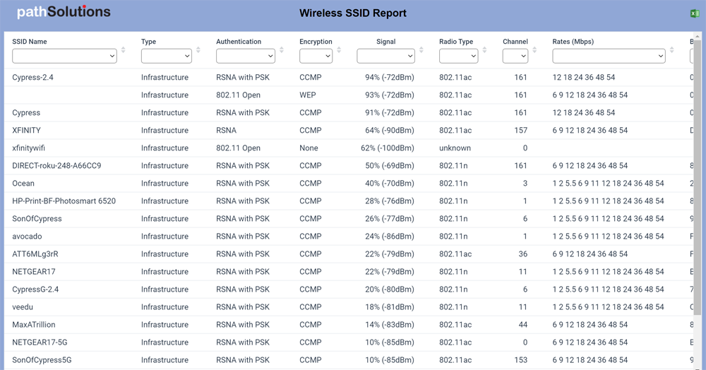 For many users, their neighborhoods are filled with all sorts of wireless signals. Channel conflicts can create significant packet loss even when signal strength is strong. This report shows all of the neighborhood SSIDs, their radio types, signal strengths, and channels used to help improve the wireless environment.