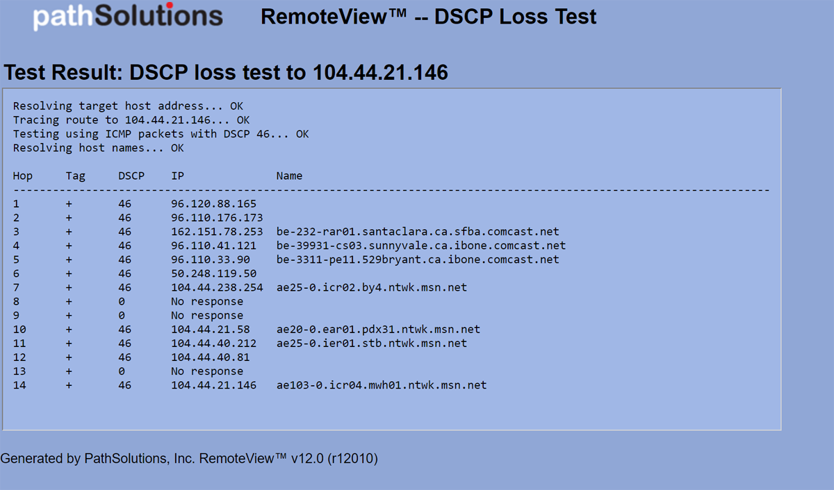 This test will determine how far a DSCP tag makes it through the network before being dropped/stripped. That way, it’s easy to determine which switch, router, or firewall is dropping the tag without having to sniff packets along the path.