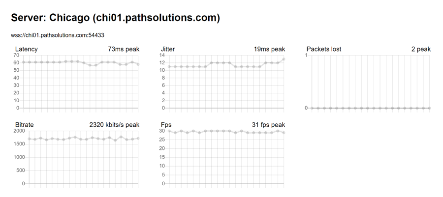If you don't have a client, any web browser can be used as a client to test network stability to/from any of our worldwide reflectors, or you can set up your own reflector in your datacenter. Elements tracked includes: latency, jitter, loss, bitrate, and FPS.