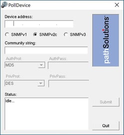 Need to easily verify SNMP communications to a network device? The PollDevice tool is completely stand-alone (no installation required) and can verify SNMP v1, v2c, and v3 communications to network equipment.