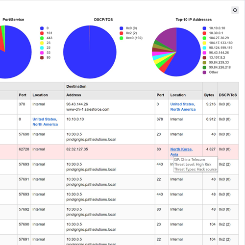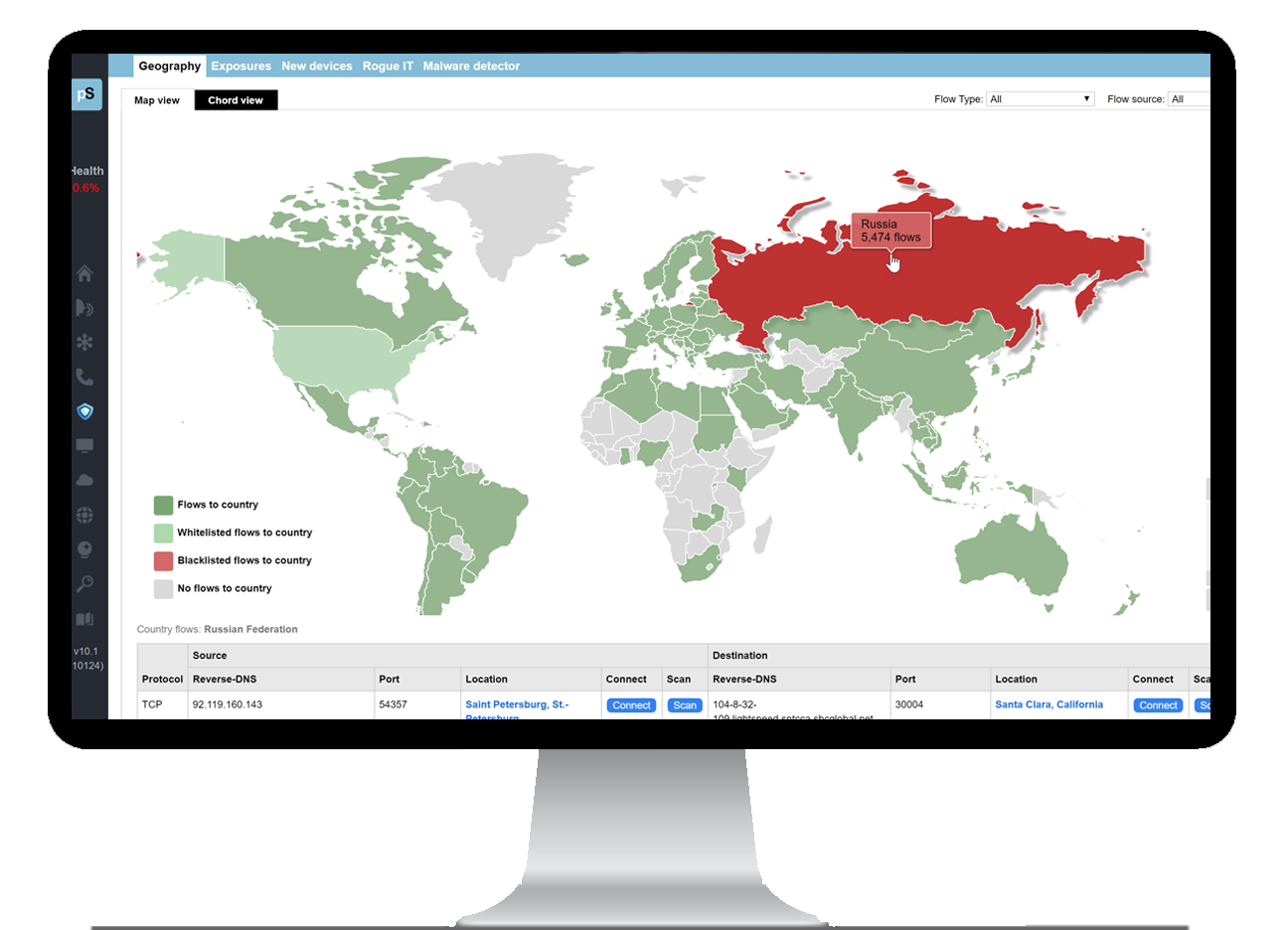 Our solution allows you to manage the risks associated with data crossing international borders: In today’s hostile cyber environment, it is essential that you have geographic awareness of your data. Data exfiltration, including the loss if intellectual properly, can be detrimental to your business. You’ll knew at a glance which countries your data is going to, and the risks associated with those communications.