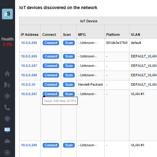 All of your IoT devices are automatically found and listed on the IoT tab. Printers, card access systems, webcams, HVAC control systems, and other IoT devices will show where they are connected (switch, port, VLAN). You can easily determine how to connect to the device with the mini port-scanner which will allow you to connect to it via Telnet, SSH, HTTP, or HTTPS. Thus, you can find where these devices are, what they are, as well as whom they communicate with. IoT devices are notorious for not having default username and passwords turned off. With TotalView Security Operations Manager, you can quickly identify this vulnerability and take action to protect against a compromise.