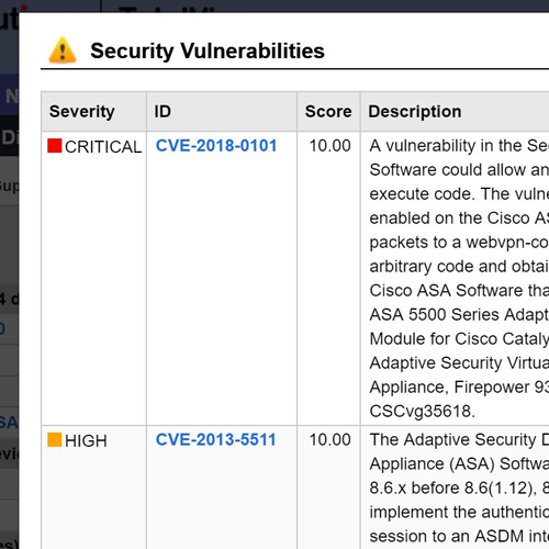 Scanning for network device vulnerabilities can be tedious and time consuming but is an essential part of maintaining strong cyber hygiene. TotalView Security Operations Manager automates this activity and rapidly discloses vulnerabilities for all infrastructure devices in your network. Daily NIST.gov checkups with the NVD means you will always know what CVE IDs are relevant to your equipment so remediation efforts can be undertaken rapidly.