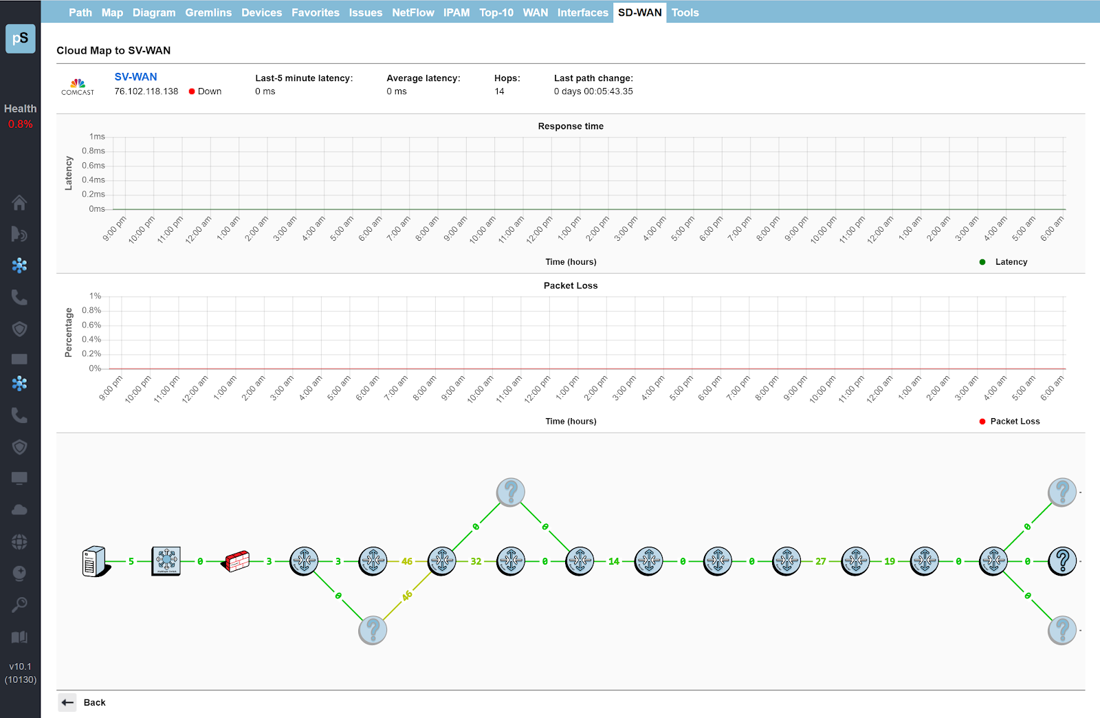 Monitoring and troubleshooting SD‐WAN connections can be difficult due to the SD‐WAN controllers not showing the complete picture of what is happening on each individual link and path. Our SD‐WAN monitoring reports can shed light on what’s happening with each link and show the full route tree that connects to each endpoint as well as what occurred along that path.