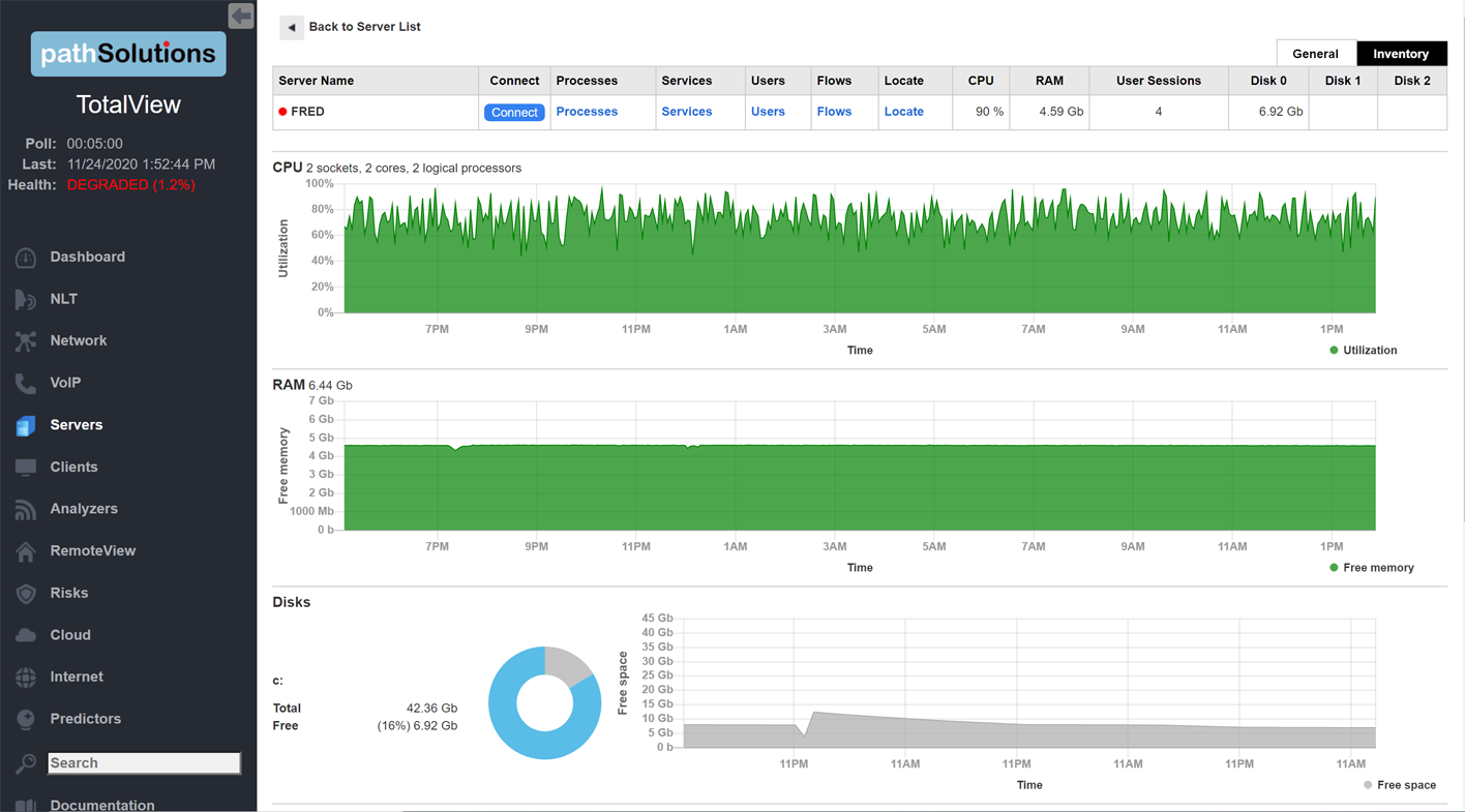 TotalView will automatically detect when a server joins the domain and automatically start monitoring it. It will track availability, CPU, free RAM, free disk space on all drives, and all of the services. It works the same for Linux servers as well. You'll get: